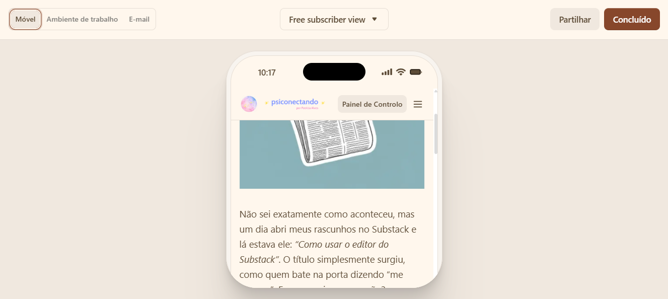 Se o Substack fosse uma casa, o editor seria a sala principal: é onde tudo acontece. É ali que você escreve, formata, organiza, insere imagens, e até decide se o conteúdo será enviado por e-mail, publicado no site, ou reservado para assinantes. Vamos por partes.